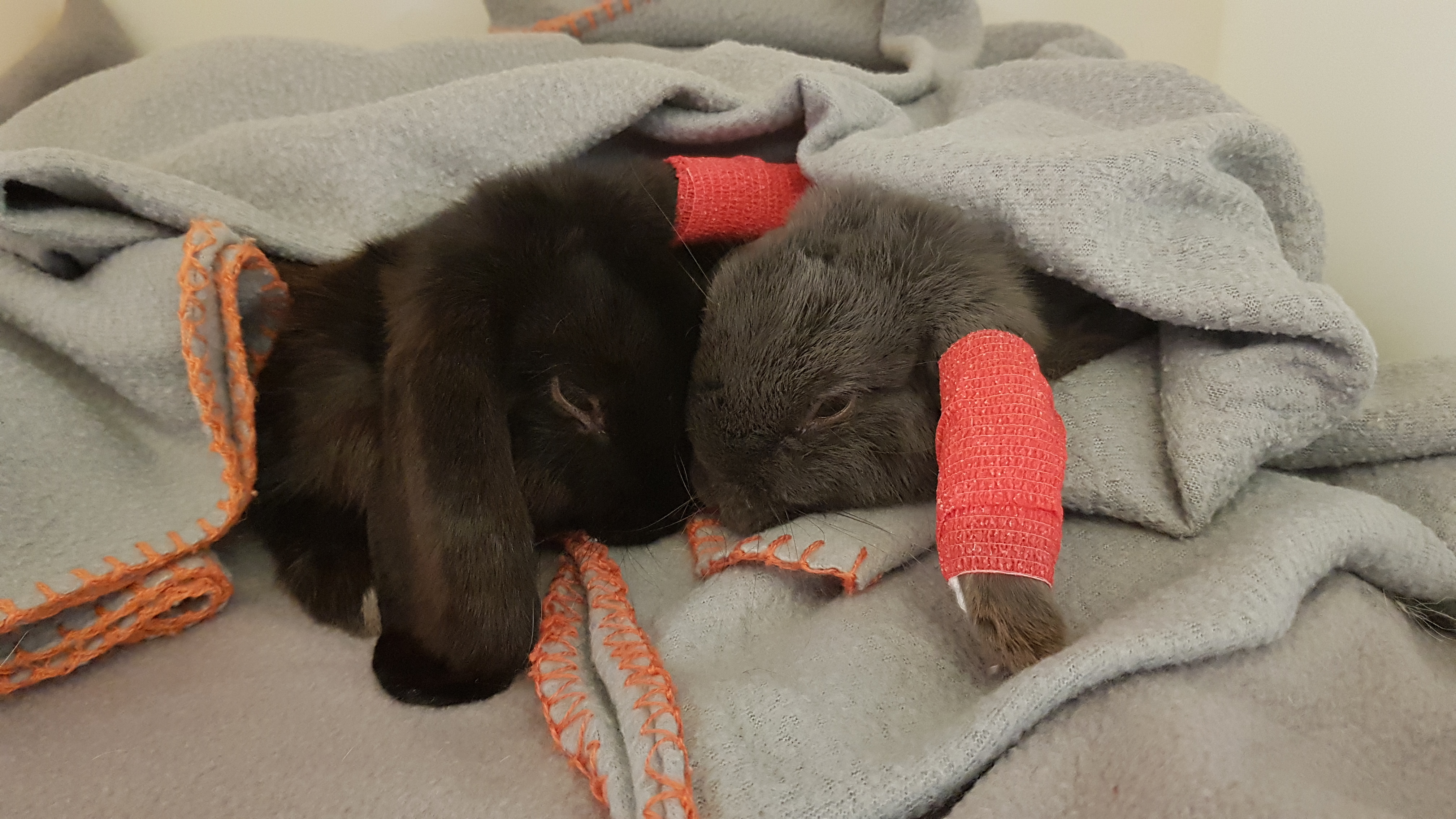 Kaniner som bor sammen må gjerne få være sammen, dette kan virke smertelindrende. Hvis det er vanskelig å følge med på om kaninen spiser/drikker, kan kaninene skilles. Da bør de fortsatt ha mulighet til å se hverandre. Unngå substrat som kan klebe seg til såret, bruk eventuelt fleecetepper eller håndkle som underlag, og tre/papirpellets i dokasse. Veterinær må kontaktes hvis såret viser tegn til infeksjon (rødhet, hevelse, varme, væsking fra såret).