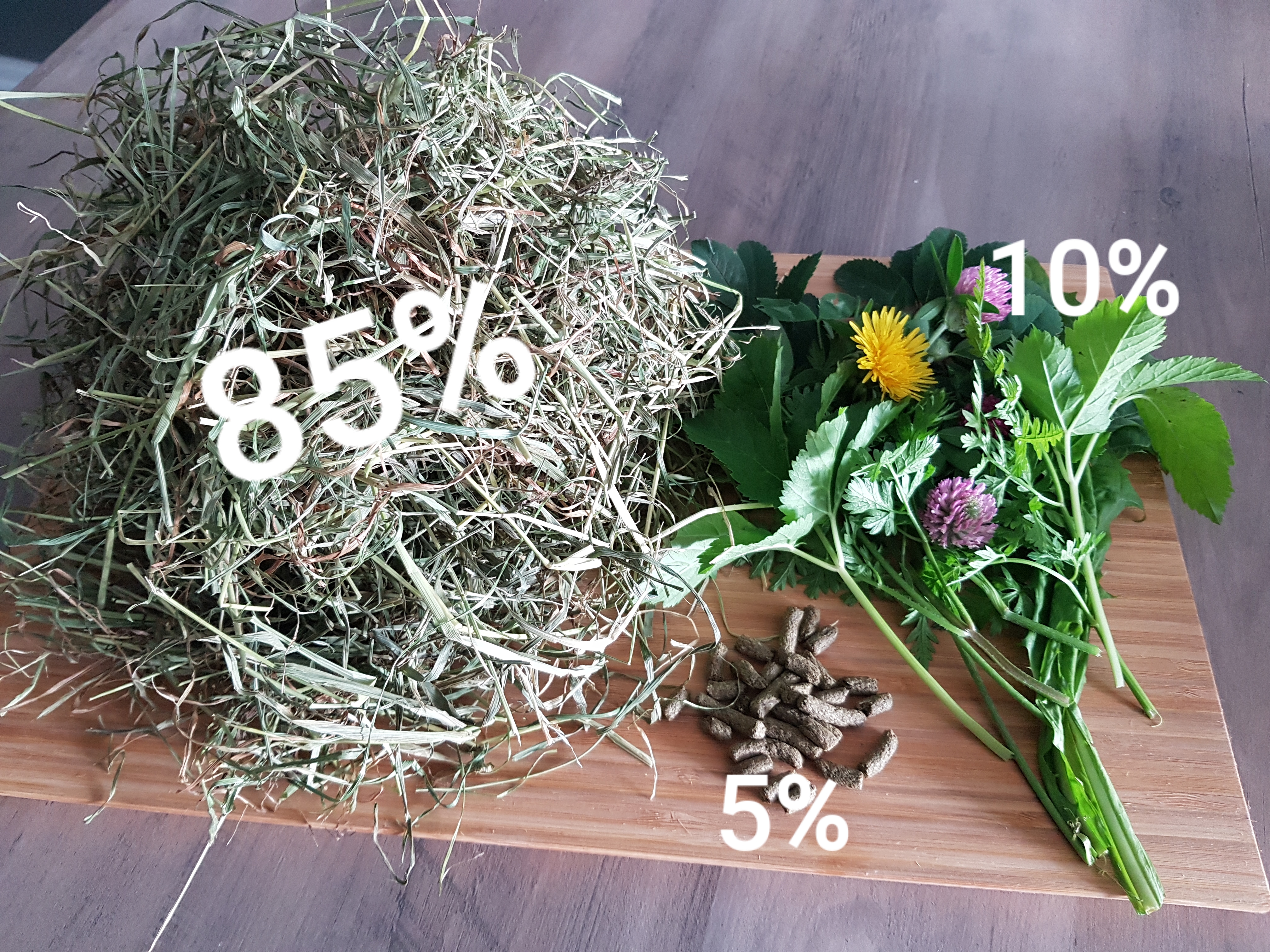 Fri tilgang på høy. Unngå alfalfabasert høy pga høyt kalsiumnivå. Tilby ca. 1 til 2 spiseskjeer pellets daglig, i tillegg til 1-2 håndfuller med ferskt grøntfôr.